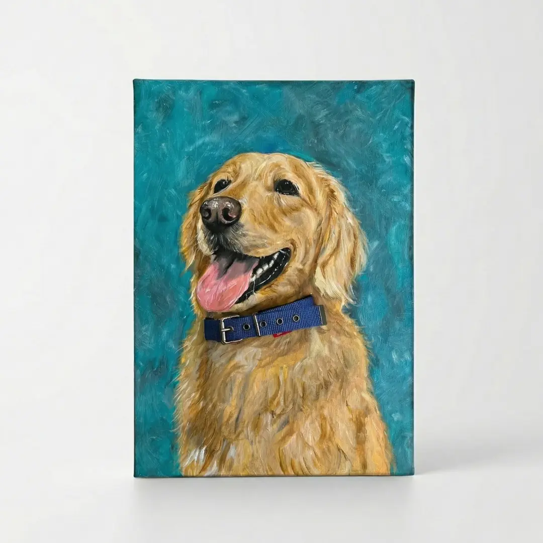 Müşterilerimiz, kaybettikleri köpeklerinin gerçek tasmasını bize ücretsiz olarak gönderiyor. Profesyonel sanatçı tarafından hazırlanan yağlı boya evcil hayvan portresi, bu gerçek tasma ile birleştiriliyor.